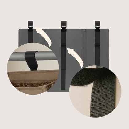 Poți fixa organizatorul de bări înguste cu ajutorul cârligelor, iar de elemente mai late folosind benzile velcro. Această libertate de montaj permite adaptarea la diverse tipuri de mobilier.