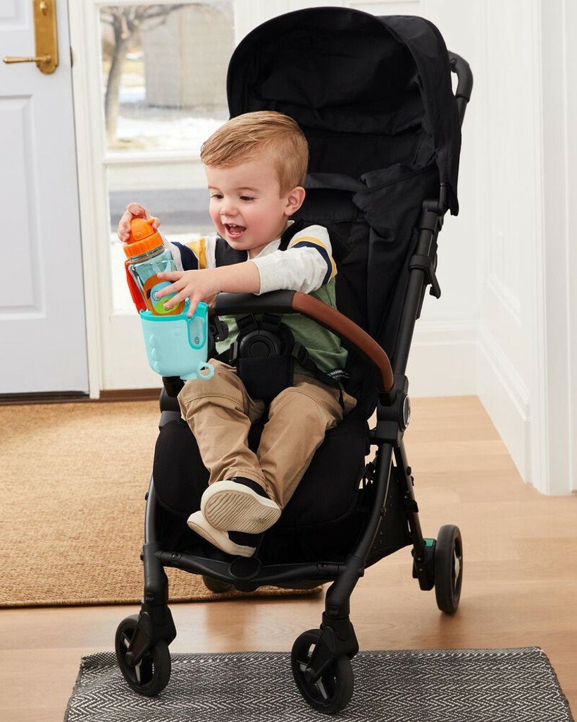 Paharul cu apă, sticla cu pai sau chiar cafeaua – toate pot fi acum la un pas distanță în timpul plimbărilor. Suportul universal pentru băuturi are un design ingenios, potrivit inclusiv pentru cănuțele cu toarte, și se fixează ușor pe majoritatea tipurilor de cărucioare, biciclete sau chiar cărucioare de cumpărături. În plus, suportul este prevăzut cu cârlige speciale pentru jucării, care îi țin ocupați pe cei mici pe durata plimbării.