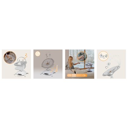 - Balansoarul este echipat cu multe caracteristici utile care fac viata mai usoara pentru parinti. Modul de noapte face ca produsul sa inceapa sa incetineasca pana cand se opreste complet. Activarea unui detector automat de miscare va porni balansoarul si muzica atunci cand copilul incepe sa se zvarcoleasca. Acest lucru se datoreaza faptului ca Bella leagana copilul la fel de instinctiv ca parintele. Puteti decide toate setarile dispozitivului din panoul de control tactil sau de la distanta utilizand telecomanda. Acest model reda 12 melodii pasnice cu un control al volumului.
