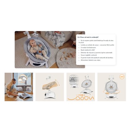 - In primele cateva luni de viata copilul ar trebui sa se odihneasca intr-o pozitie culcat - complet plata - aceasta fiind pozitia optima si cea mai sanatoasa pentru copil. Din preocupare pentru dezvoltarea psihomotorie corecta a copilului, am creat balansoarul Bella set cu landou in care copilul se poate bucura de beneficiile acestuia intr-o pozitie complet inclinata. Balansoarul va servi din primele zile de viata ale bebelusului pana cand ajunge la o greutate de 9 kg sau pana cand micutul tau incepe sa stea independent. Este o solutie 2 in 1 pentru ca vine cu 2 locuri - un landou si un balansoar traditional - atunci cand devine mai activ si mai curios despre mediul inconjurator. Ambele parti superioare sunt rotative 360 grade, permitandu-va nu numai sa decideti directia de miscare, ci si sa pozitionati produsul astfel incat sa puteti mentine intotdeauna contactul vizual cu cel mic. Elementele pot fi schimbate liber in functie de nevoile copilului tau. Instalarea lor dureaza doar cateva secunde.