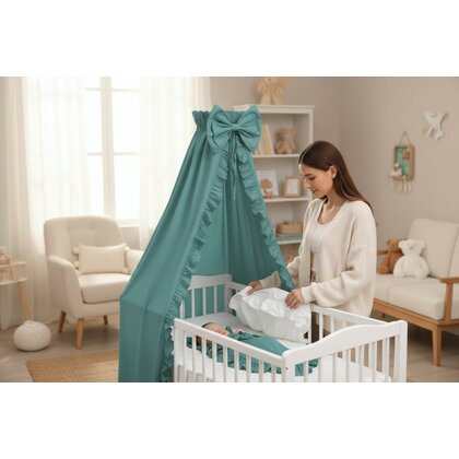 Baldachin, MimiNu, Pentru patut, Cu funda si volanas, 210x145 cm, Material certificat Oeko Tex Standard 100, Colectia Royal, Nepal Green