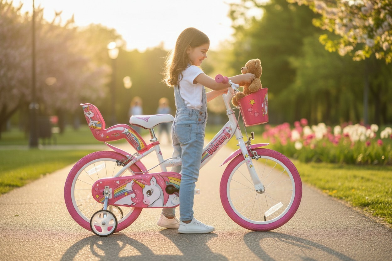 ✔️Experienta distractiva si colorata – bicicleta este personalizata cu elemente unicorn, transformand fiecare iesire intr-o aventura magica.