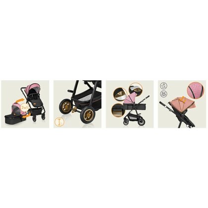 Carucior 2 in 1, Lionelo, Amber, Cadru aluminiu, Cu landou intarit si salteluta moale, Reversibil, Maner ajustabil, Huse pentru picioare, ploaie, Plasa de tantari, Geanta parinti, Pana la 22 kg, EN1888-1, EN1888-2, EN1466, Roz