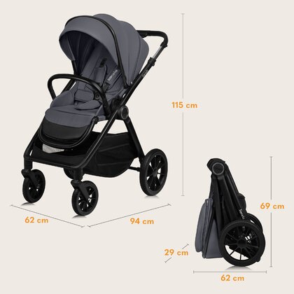 Caruciorul are un design elegant, fara a compromite practicitatea. Functii practice includ carlige pentru geanta pe manerul caruciorului, un organizator cu fermoar in cosul de cumparaturi, un suport pentru pahar si un fermoar dublu pe husa landoului. Culorile atent coordonate si brandingul discret creeaza o impresie generala de eleganta rafinata.