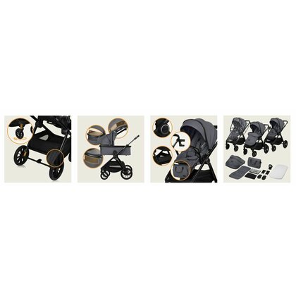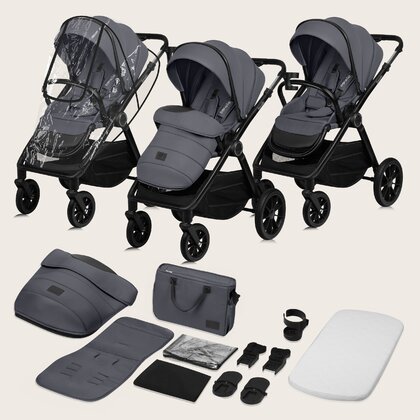Carucior 3 in 1, Lionelo, Layla, Cadru din aluminiu, Cu landou intarit si salteluta din spuma AiryDots, Cu scoica auto testata ADAC, Reversibil, Cu sistem de ventilatie 3D, Cu accesorii, Pana la 22 kg, EN1888-1 EN1888-2 EN1466 ECE R129, Gri