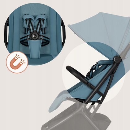 Inchizatoarea magnetica faciliteaza prinderea centurilor. Cosul mare cu clapeta laterala permite acces rapid chiar si cand copilul doarme.