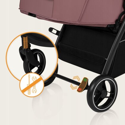 Rotile mari si fara intretinere din spuma EVA se caracterizeaza prin universalitate - sunt usoare si durabile in acelasi timp. Capacitatea de rotatie la 360_ face ca rotile sa fie foarte manevrabile si sa ofere posibilitatea de a manevra usor. Amortizarea dubla - plasata in fata si in spate - garanteaza confort chiar si in timpul traversarii denivelarilor. Caruciorul are frana centrala cu pedala si semnalizare.