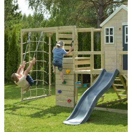 Copiilor tai le place sa se catere si se bucura de agatat in plase? Modulul de sport atasat va fi potrivit pentru cei mai activi si de neoprit copii. Locul de joaca multifunctional pentru sport va oferi copiilor posibilitatea de a urca folosind peretele de catarat la o inaltime de 120 cm. Plasa de catarare plasata in lateral fara limite pentru distractia de catarare cu aceasta plasa de catarare robusta cu aspect natural de coarda. Setul cu bara pentru maimute face ca acest set de joaca din curte sa fie mai provocator pentru copii. Un accesoriu de bucatarie cu un robinet adevarat de apa plasat in spatele peretelui de catarat va adauga valoare suplimentara modulului de gimnastica. Va fi un plus grozav pentru a va rasfata prietenii sau parintii cu mancare proaspat preparata pe doua plite dupa recreere activa. De asemenea, va fi excelent pentru distractie cu apa si noroi, datorita vasului de plastic usor de indepartat si a robinetului de apa real, la care puteti conecta un furtun de gradina.