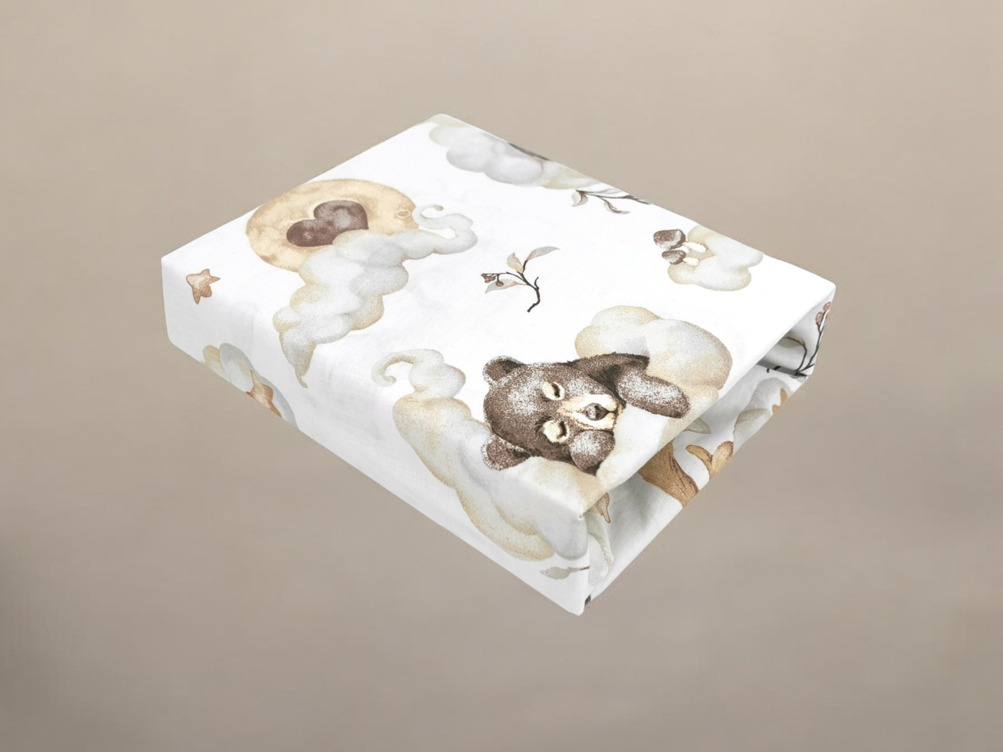 Cearceaf cu elastic, Qmini, Pentru patut 120x60 cm, Din bumbac certificat Oeko Tex Standard 100, Teddy Bear and Friends Beige