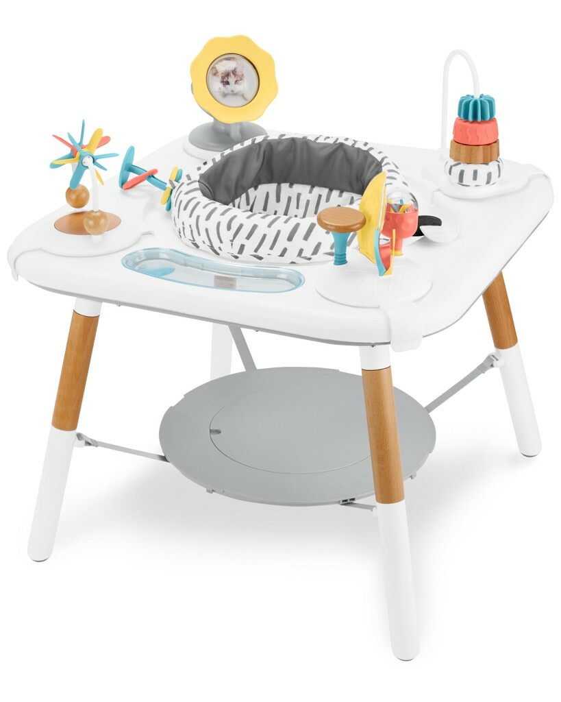Conceput în colaborare cu specialiști Montessori, acest centru de activități stimulează curiozitatea naturală a copilului și susține joaca senzorială, explorarea independentă și învățarea prin descoperire. Realizat cu detalii din lemn certificat FSC și peste 25 de activități de dezvoltare, produsul crește odată cu bebelușul datorită designului său în 3 etape: centru de joacă interactiv cu scaun rotativ, sprijin pentru primii pași și, mai târziu, masă de joacă pentru copil.