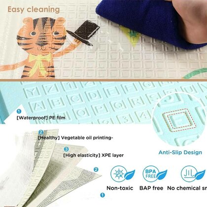 Material sigur si confortabil: realizat din spuma XPE moale, elastica si rezistenta la socuri, pentru a amortiza caderile si a proteja copilul in timpul jocului.