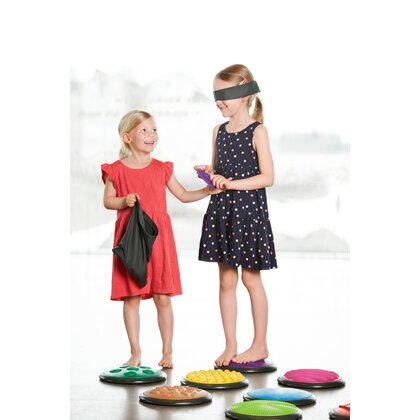 Un set de 5 discuri cu texturi tactile diferite într-o gamă de culori (5 discuri largi și 5 mici), un material pentru a lega ochii și un sac larg de pânză.