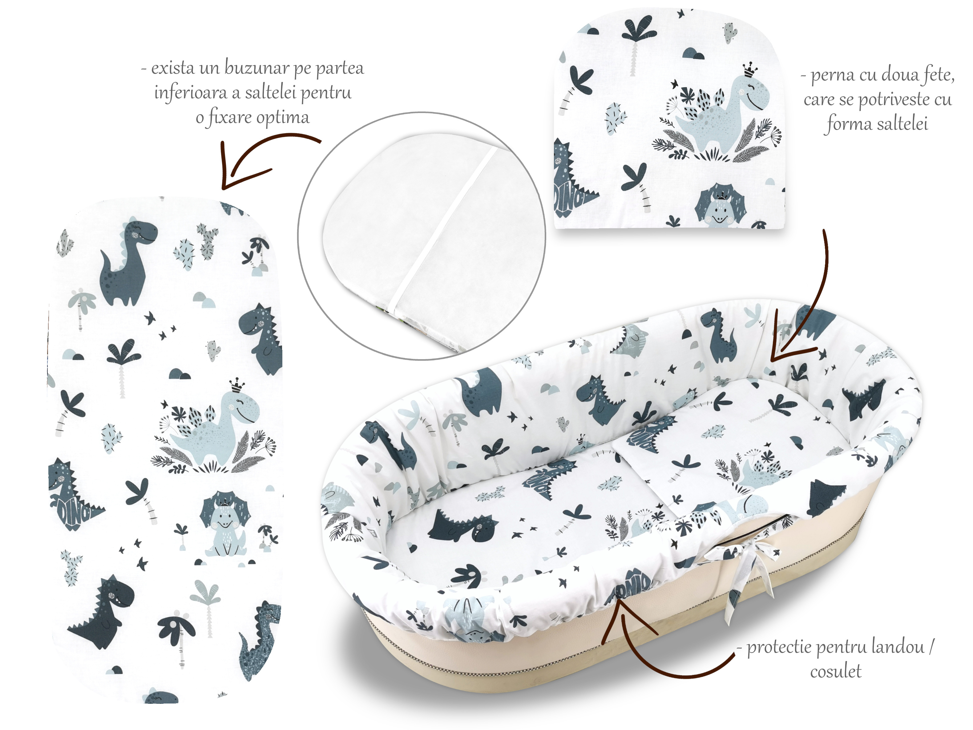 Set pentru landou/cosulet, MimiNu, Cu protectie, saltea si pernuta, Din bumbac certificat Oeko Tex Standard 100, Dino Granat
