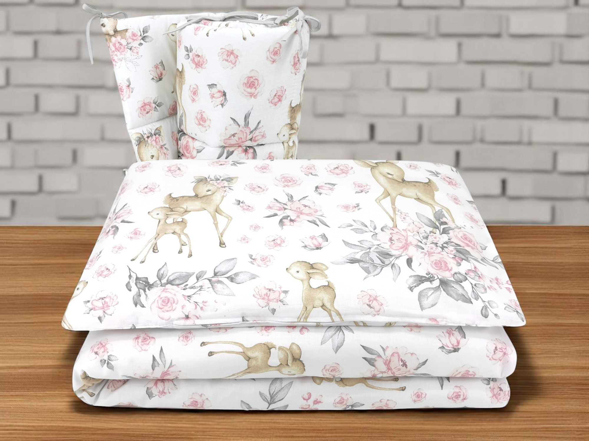 Lenjerie patut cu 3 piese, MimiNu, Pentru patut 120x60 cm, Cu protectie laterala, Din bumbac certificat Oeko Tex Standard 100, Sweet Deer Pink