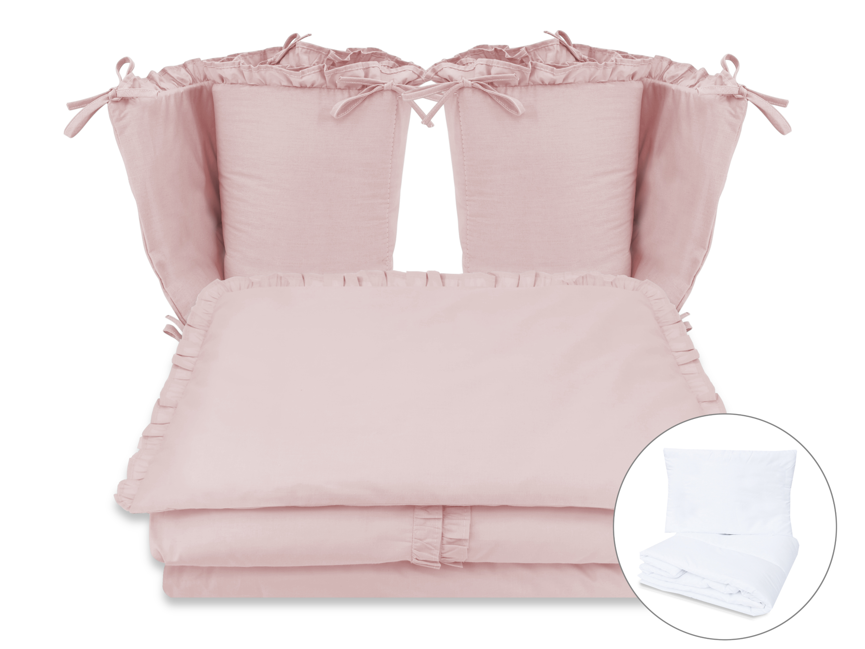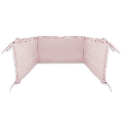 Transforma patutul bebelusului intr-un colt regal de vis cu setul de lenjerie MimiNu Royal Powder Pink, realizat manual in Polonia din bumbac 100% certificat Oeko Tex Standard 100. Designul elegant cu volanase decorative, tesatura moale si umplutura antialergica creeaza un ambient sigur, confortabil si plin de stil.