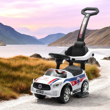 Masinuta de impins, Baby Mix, Ambulanta, Cu maner de impins detasabil, Cu protectii laterale, Cu melodii si claxon, Cu suport jucarii sub sezut