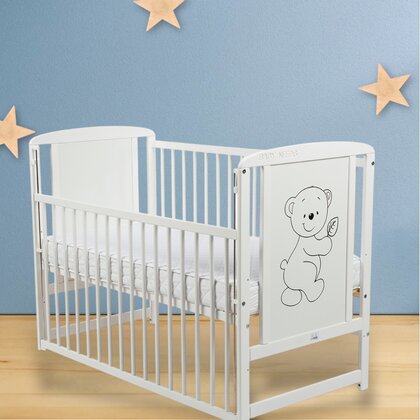 BabyNeeds - Patut din lemn Timmi 120x60 cm, Cu laterala culisanta, Din lemn de pin si mdf, Stabil si rezistent, Inaltime saltea reglabila pe 3 nivele, Laterala cu 3 bete detasabile, EN716-1, EN716-2, Alb + Saltea 8 cm: