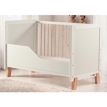 Fabricat din pin australian, cu panouri MDF si protectii PVC laterale, patutul este gandit sa reziste in timp si sa ofere protectie – inclusiv in perioada eruptiilor dentare, gratie barelor laterale protejate.
