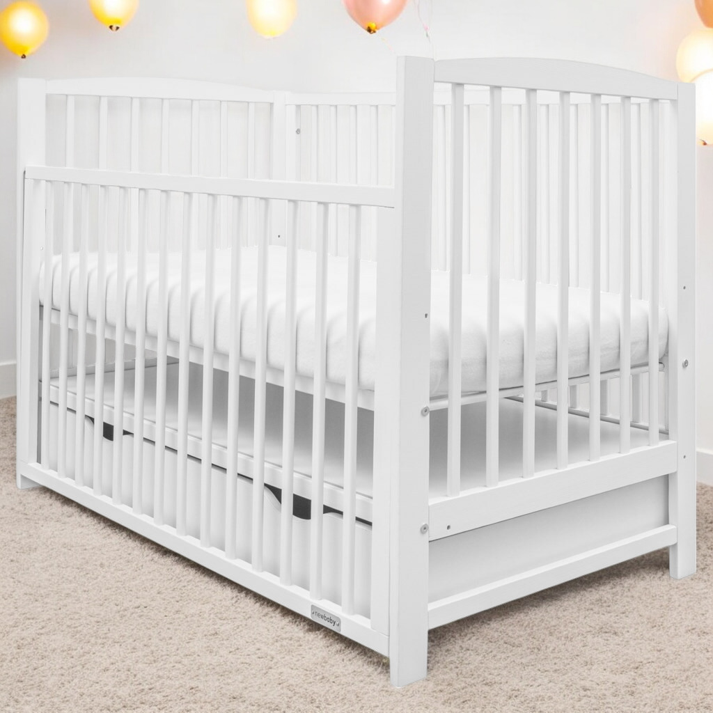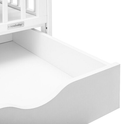 Patut din lemn bebe, 120x60 cm, Cu sertar cu capac si laterala culisanta, Certificat lemn FSC, Reglabil pe inaltime in 3 pozitii, Conform cu EN 716-1:2008, EN 716-2:2008, New Baby, Lilly, White, Resigilat