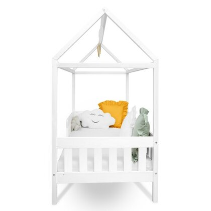 Forma de casuta transforma patutul intr-un loc cald si familiar, care ii ofera copilului un sentiment de apartenenta si siguranta. Bariera de protectie il pazeste in timpul somnului, prevenind caderile accidentale, dar oferind in acelasi timp libertate de miscare si independenta.