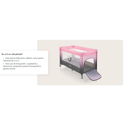 Solutia ideala pentru nopti petrecute departe de casa. Patutul se pliaza rapid intr-o forma compacta si este gata de drum!