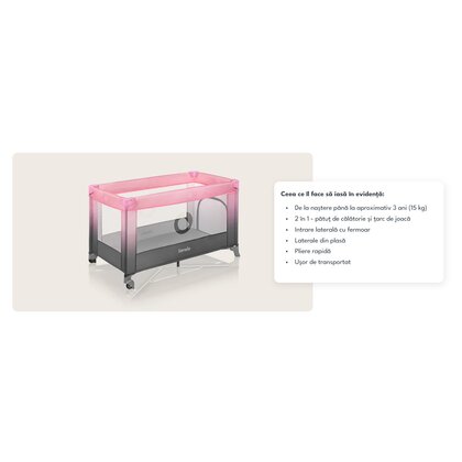 Intrarea laterala permite copilului sa intre si sa iasa cu usurinta. Cele doua roti faciliteaza mutarea patutului prin casa, iar lateralele din plasa asigura ventilatie optima si contact vizual intre parinte si copil. Stefi este un patut, dar si un tarc practic, care combina perfect utilitatea zilnica cu confortul necesar in calatoriile in familie.