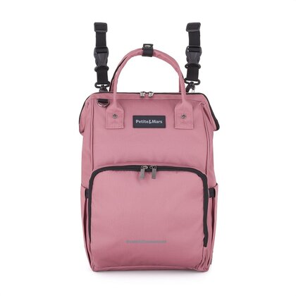 Rucsac pentru mamici, Petite&Mars, Jack, Cu 11 compartimente, Cu buzunare termice, Saltea de infasat inclusa, 30 x 42 x 15 cm, Dusty Rose