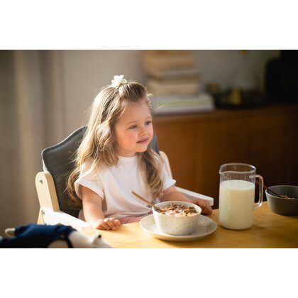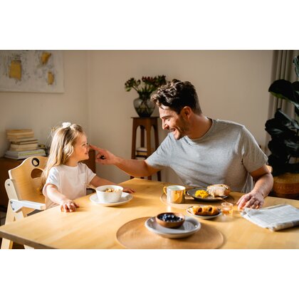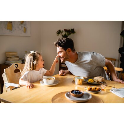 Tava generoasa ofera suficient spatiu pentru mese si activitati, facilitand invatarea hranirii independente. Materialul rezistent permite utilizarea zilnica fara griji.