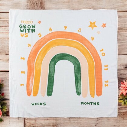 - Cu un design colorat si vesel, aceasta paturica poate marca o etapa din viata ta. Modelul plasat pe acesta si indicatorii inclusi in set va permit sa creati fotografii memorabile ale etapelor copilului de la o luna la un an. Norisorul pentru a marca numarul, fereastra pentru a selecta perioada.