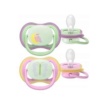 Set 2 suzete, Philips Avent, Colectia Ultra Air, Ortodontice, Fara BPA, Cu orificii mari de aerisire, 6-18 luni, Pentru noapte, Fosforescente, Cu Model, Verde/Roz