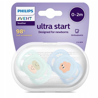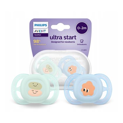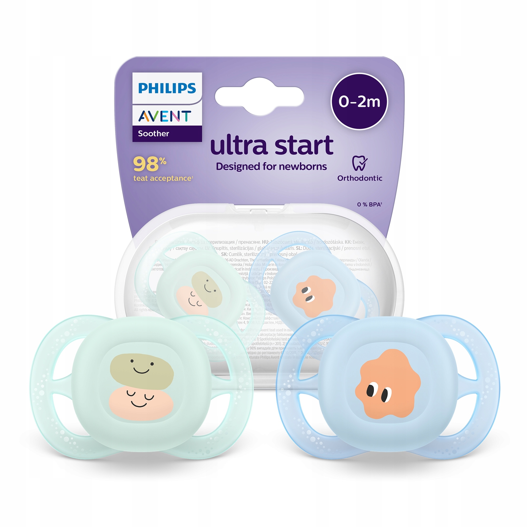 Set 2 suzete, Philips Avent, Colectia Ultra Start, Ortodontice, Fara BPA, Sustenabile, Conceputa pentru gurite micute, 0-2 luni, Cu model, Verde/Albastru