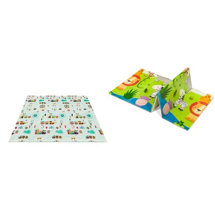 - Cu două fețe: covorașul nu este doar un loc de joacă sigur pentru un copil, ci și o modalitate excelentă de a petrece timpul împreună cu părinții. Are două imprimeuri unice pe fiecare parte. Pe prima latură sunt animale, iar pe a doua un drum cu clădiri.